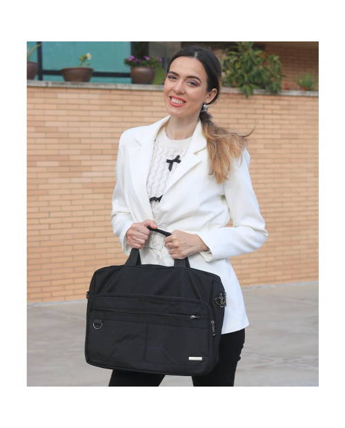 Incorpora um bolso com fecho central, bolsos e compartimentos interiores.
